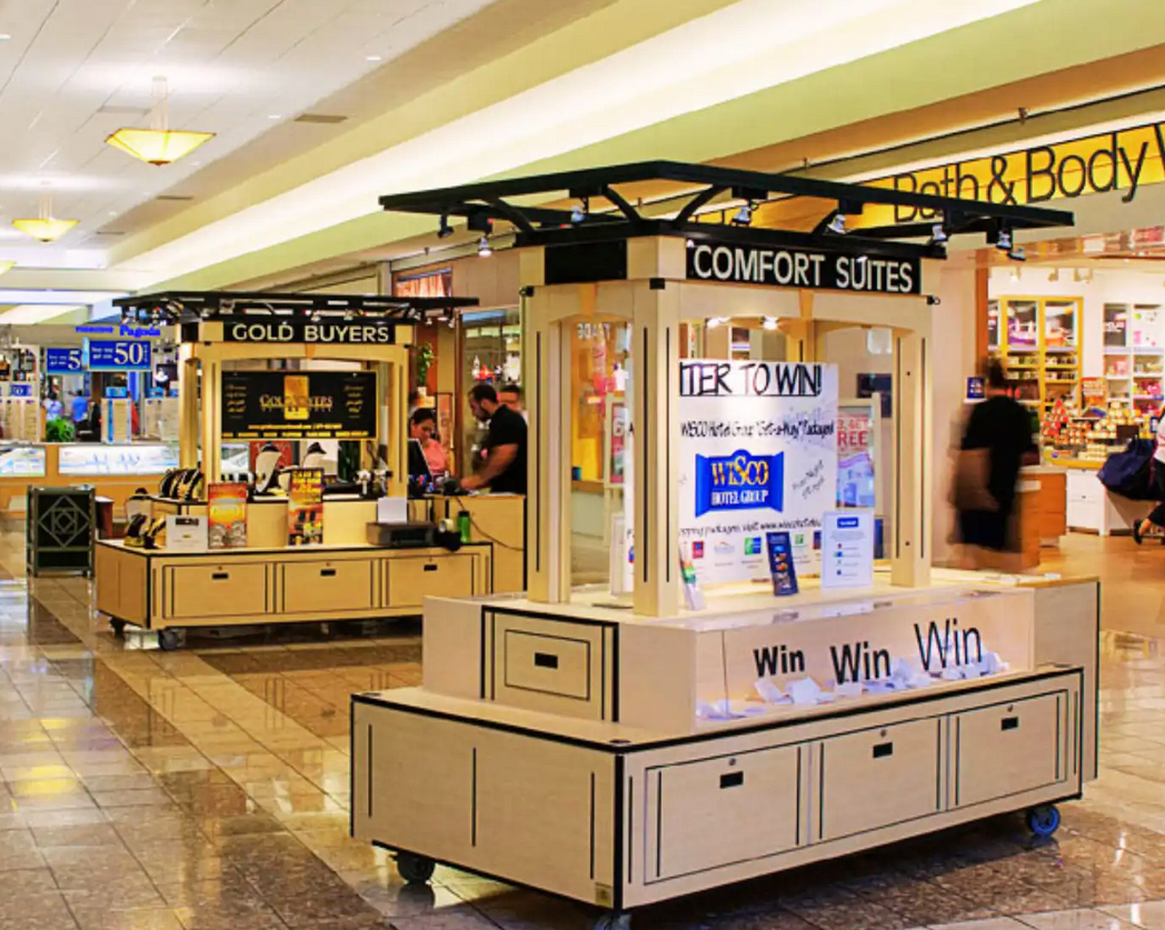 • Branding & fit-out compatibility: Ensure your stand or kiosk can integrate brand colours, signage, lighting, digital components.